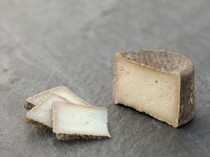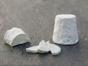 Quallada làctica de curta maduració a partir de llet pasteuritzada de cabra, amb escorça florida i de color blanc al tall.